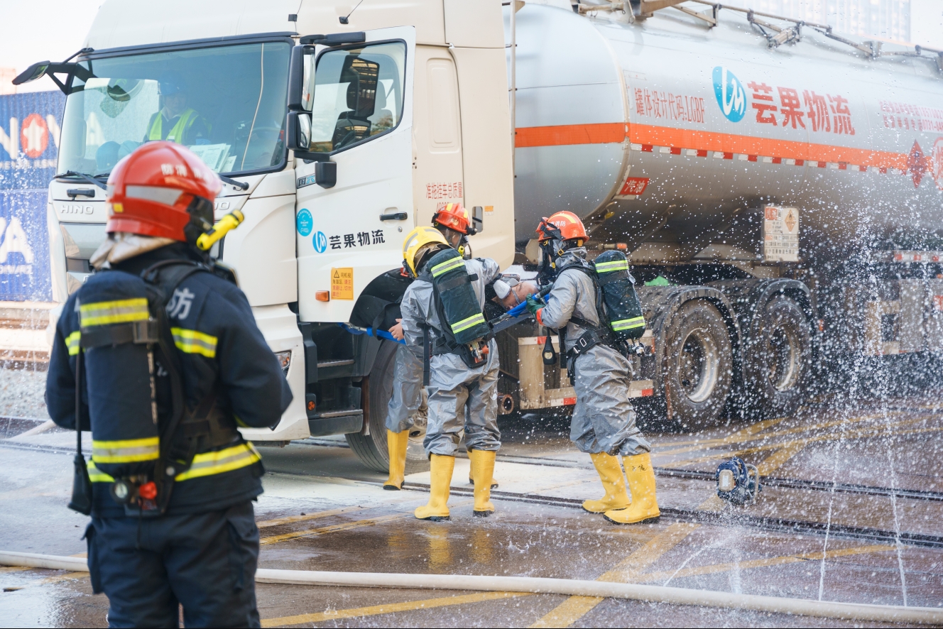 11月21日,2025年長沙市鐵路專用線道口;肥鹿示C合應(yīng)急演練在長沙新港公司舉行,演練由長沙市交通運(yùn)輸局主辦,長沙新港公司承辦,長沙市市生態(tài)環(huán)境局、開福區(qū)消防救援大隊(duì)、長沙泰和醫(yī)院參加。 演練模擬一輛裝有甲醇二甲胺的;凡酃捃嚱(jīng)過鐵路道口時,因雨天路滑發(fā)生事故,導(dǎo)致裝載物泄露,一名司乘人員被困車內(nèi),一列火車即將通過道口,情況十分危急。道口值班人員發(fā)現(xiàn)事故后,第一時間通知車站信號樓,并緊急采用手旗信號截停列車,避免發(fā)生二次事故并造成更嚴(yán)重的后果,同時,值班員迅速向長沙新港公司報(bào)告事故情況,包括泄漏罐車的位置、泄漏程度、是否有起火、人員受困或傷亡等信息,長沙新港公司迅速啟動應(yīng)急預(yù)案。應(yīng)急救援、警戒疏散等多個小組攜帶裝備5分鐘內(nèi)集結(jié)完畢,奔赴事故現(xiàn)場處置。隨后,消防救援人員、醫(yī)療救護(hù)人員、環(huán)境監(jiān)測人員等各司其職,聯(lián)合處置了這一起突發(fā)事件。