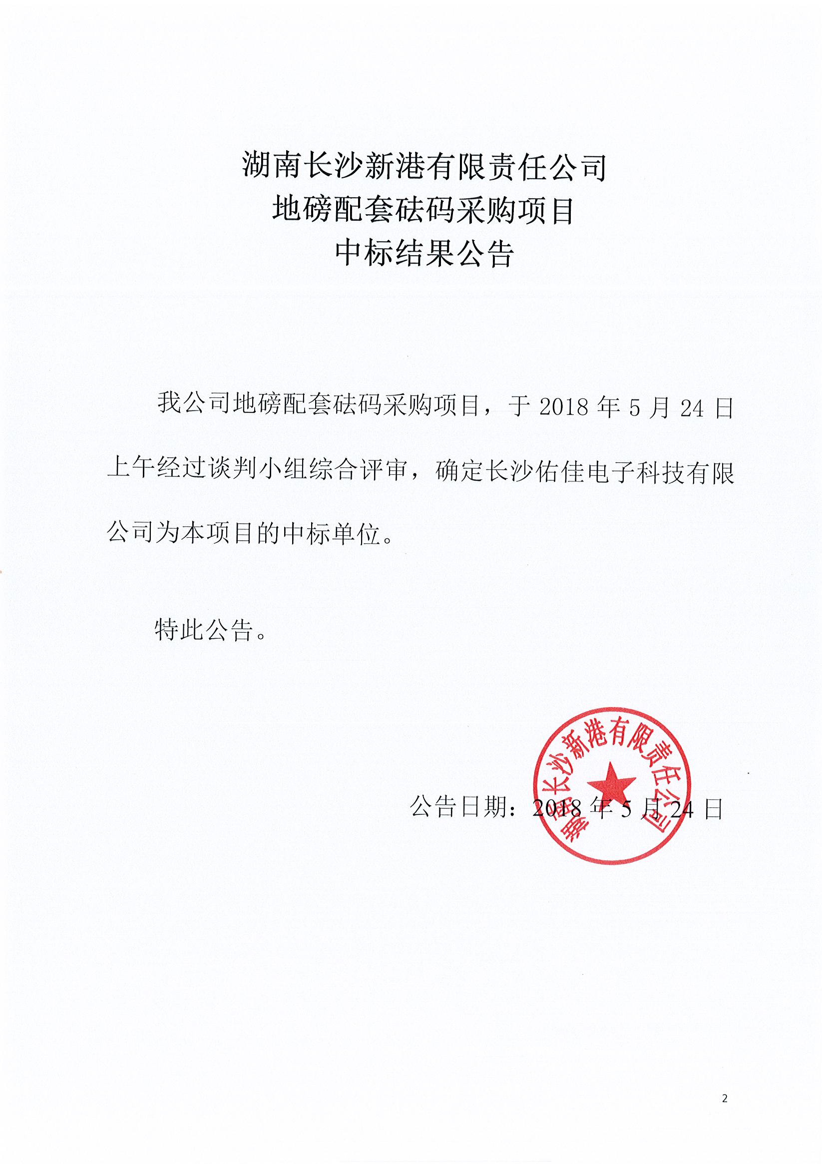 湖南長沙新港有限責任公司 地磅套砝碼采購項目中標結(jié)果公告