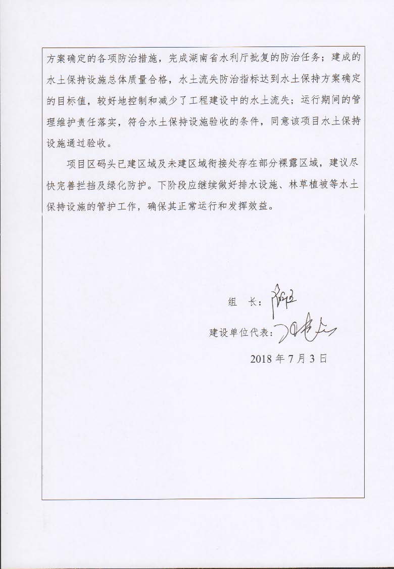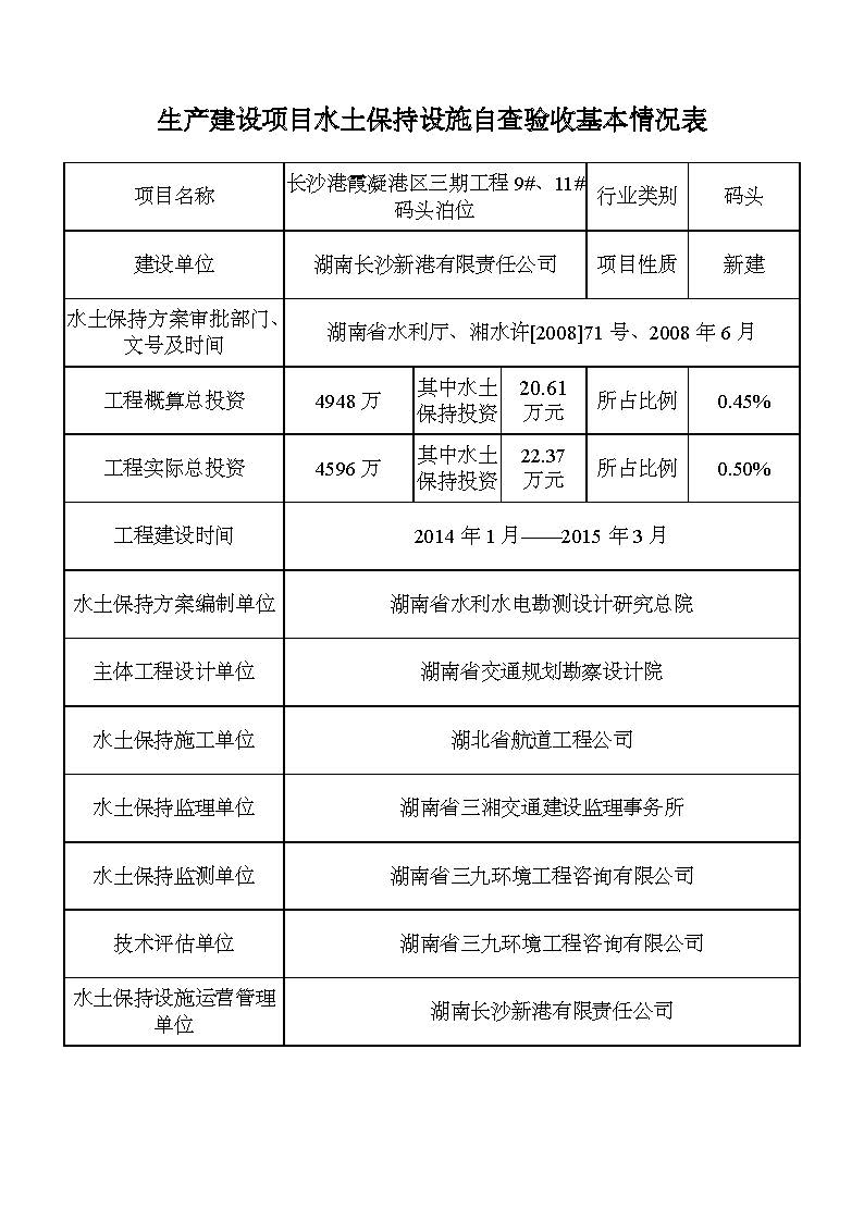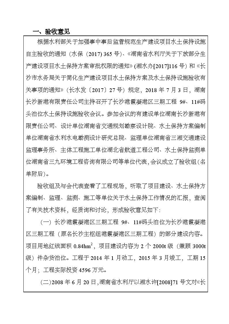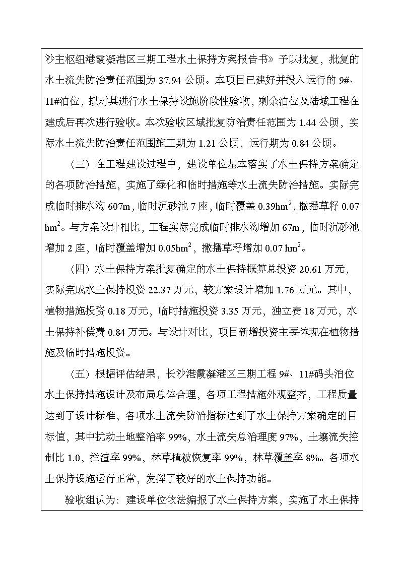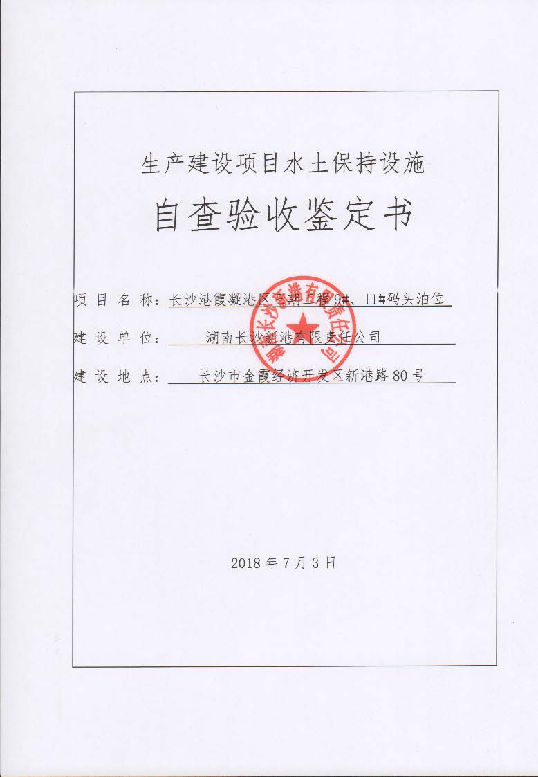 根據(jù)水利部關(guān)于加強事中事后監(jiān)管規(guī)范生產(chǎn)建設(shè)項目水土保持設(shè)施自主驗收的通知(水保(2017) 365號)、《湖南省水利廳關(guān)于下放部分生產(chǎn)建設(shè)項目水土保持方案審批權(quán)限的通知》(湘水辦[2017]116號)和《長沙市水務(wù)局關(guān)于簡化生產(chǎn)建設(shè)項目水土保持方案及水土保持設(shè)施驗收有關(guān)事項的通知》(長水發(fā)〔2017〕27號)規(guī)定,2018年7月3日,湖南長沙新港有限責(zé)任公司主持召開了長沙港霞凝港區(qū)三期工程9#、11#碼頭泊位水土保持設(shè)施驗收會議,會議成立了驗收組。 通過深入工程現(xiàn)場核查,并查閱相關(guān)檔案資料,驗收小組認(rèn)為本工程積極落實了各施工區(qū)域的水土流失防治工作,水土保持設(shè)施質(zhì)量總體合格,水土流失防治指標(biāo)達(dá)到了水土保持方案確定的目標(biāo)值,符合水土保持設(shè)施竣工驗收的條件。驗收組一致同意長沙港霞凝港區(qū)三期工程9#、11#碼頭泊位水土保持設(shè)施通過驗收。經(jīng)驗收組與會議審議,形成了《長沙港霞凝港區(qū)三期工程9#、11#碼頭泊位水土保持設(shè)施自查驗收鑒定書》。