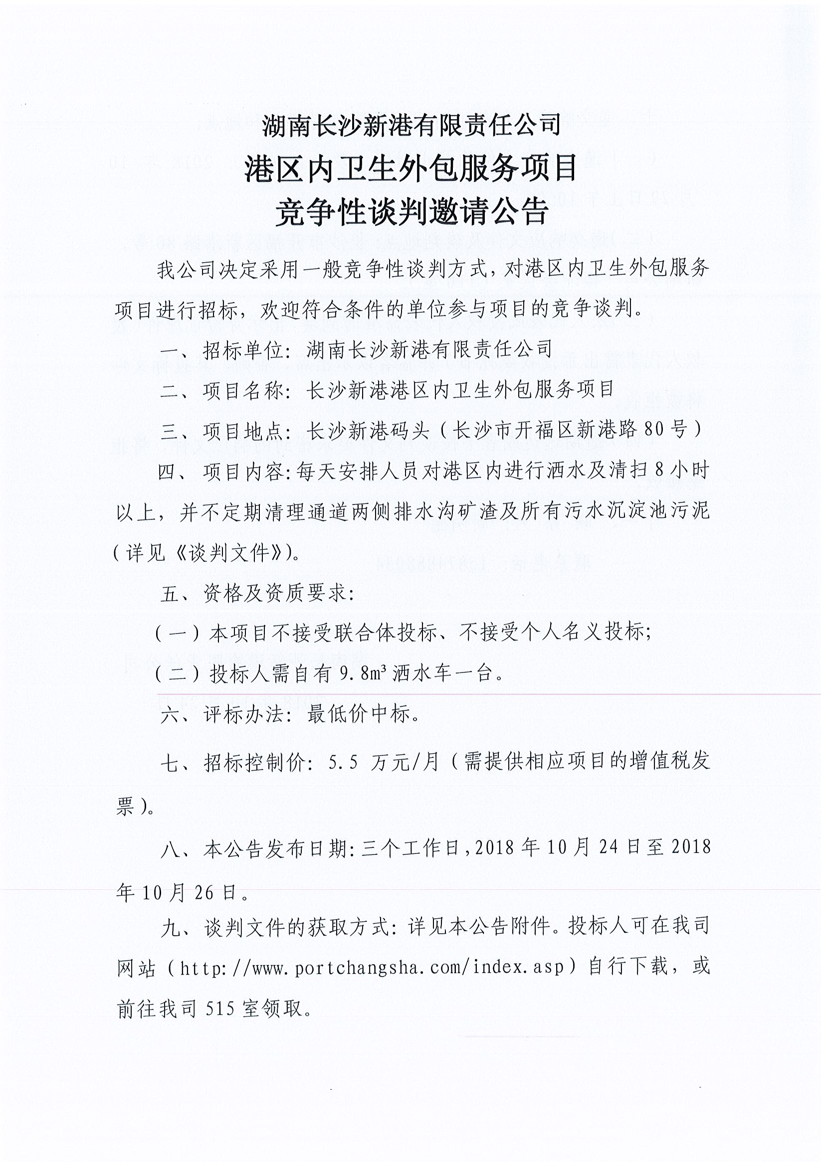 湖南長(zhǎng)沙新港有限責(zé)任公司 港區(qū)內(nèi)衛(wèi)生外包服務(wù)競(jìng)爭(zhēng)性談判邀請(qǐng)公告