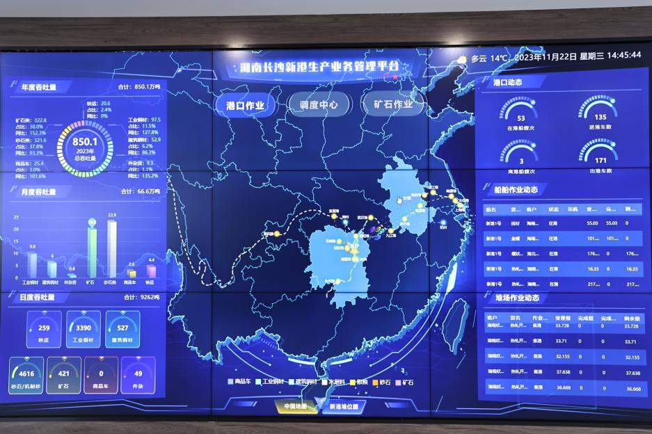二、創(chuàng)新賦能:智慧綠色雙引擎驅(qū)動升級 數(shù)字化轉(zhuǎn)型是長沙新港三年變革的鮮明注腳。2023年,長沙新港智控調(diào)度中心和生產(chǎn)業(yè)務(wù)管理平臺全面上線,實(shí)現(xiàn)船舶動態(tài)監(jiān)測、港口實(shí)時監(jiān)控等智能化管理;2024年,“電永磁鐵吊具”等設(shè)備投產(chǎn),有效提升裝卸效率,降低人力成本;2025年,依托信息化平臺構(gòu)建“數(shù)字港+多式聯(lián)運(yùn)”模式,提高貨物周轉(zhuǎn)效率,縮短客戶報港、提貨流程。