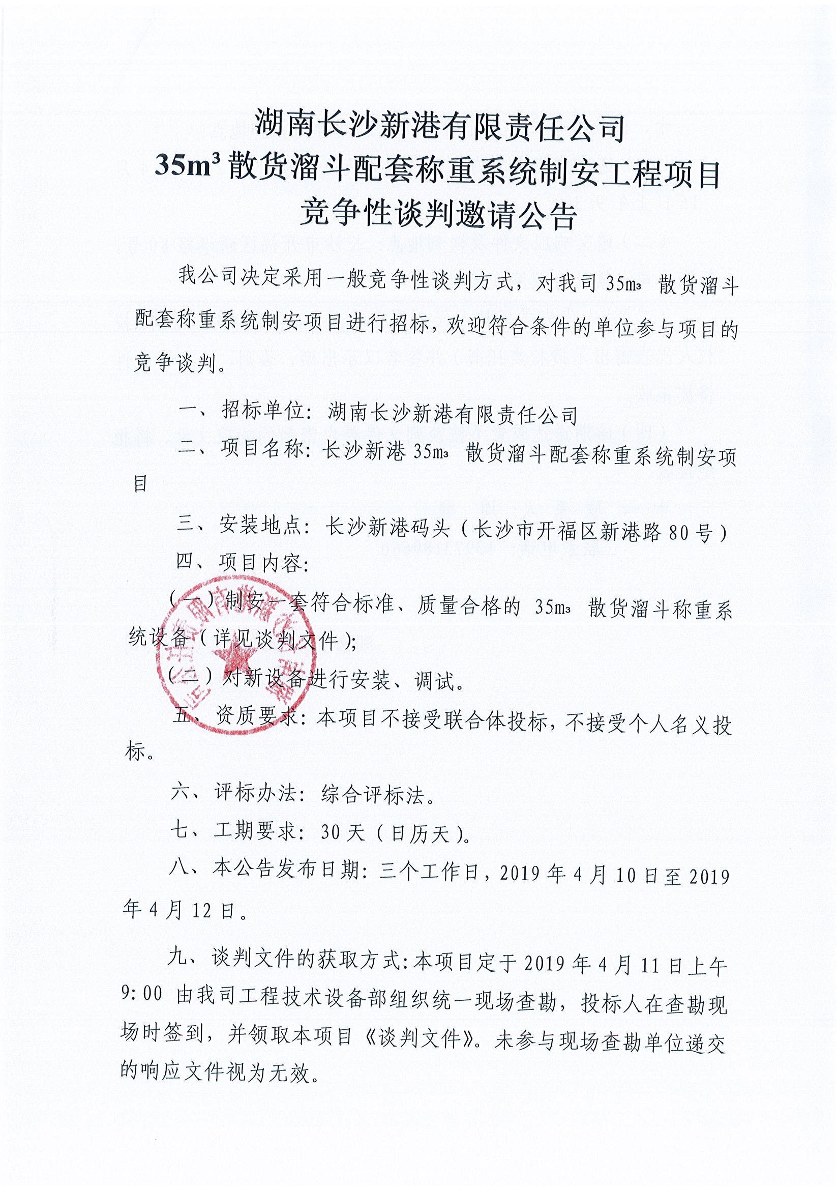 湖南長沙新港有限責(zé)任公司35m³散貨溜斗配套稱重系統(tǒng)制安工程項(xiàng)目競爭性談判邀請公告