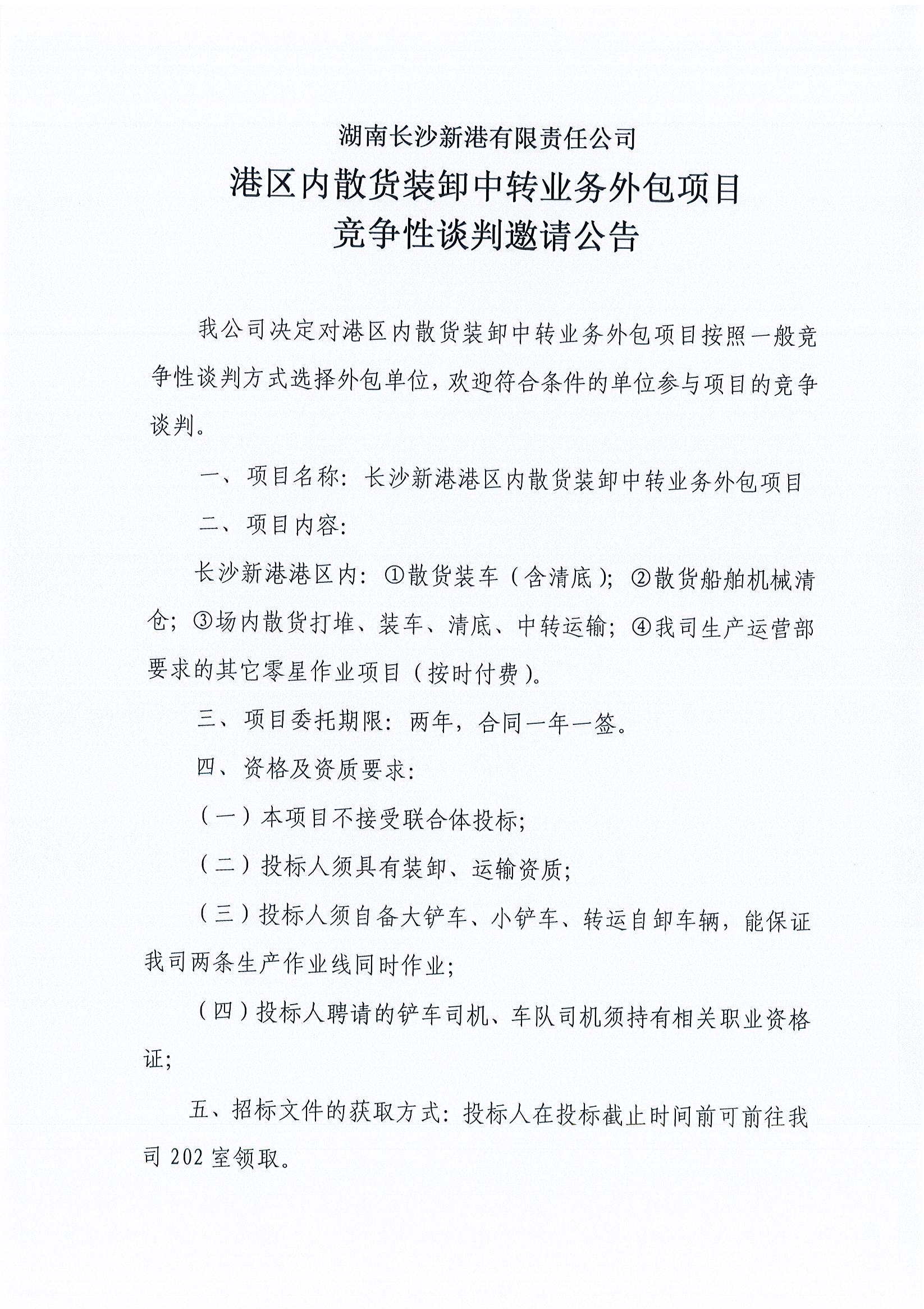 湖南長沙新港有限責(zé)任公司港區(qū)內(nèi)散貨裝卸中轉(zhuǎn)業(yè)務(wù)外包項(xiàng)目競爭性談判邀請公告