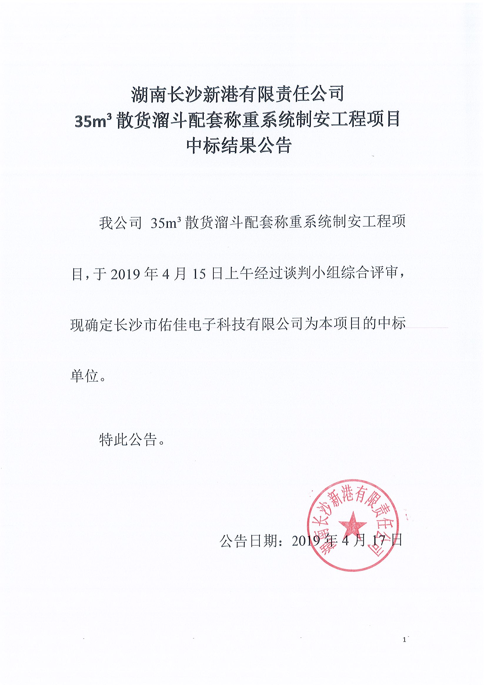 湖南長(zhǎng)沙新港有限責(zé)任公司35m³散貨溜斗配套稱重系統(tǒng)制安工程項(xiàng)目中標(biāo)結(jié)果公告