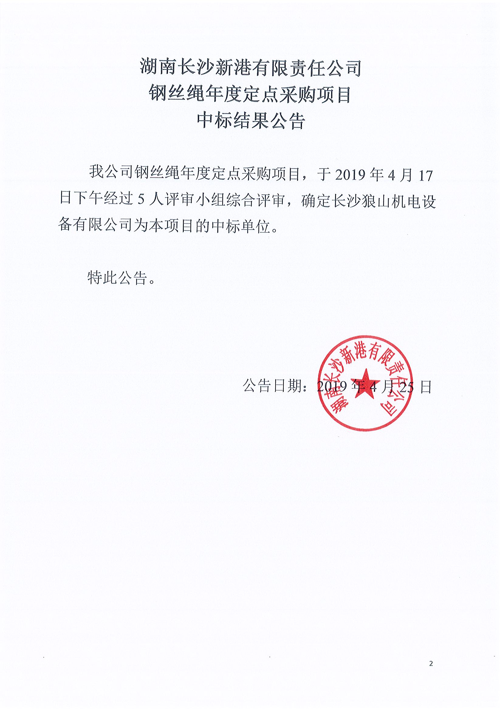 湖南長沙新港有限責(zé)任公司鋼絲繩年度定點(diǎn)采購項目中標(biāo)結(jié)果公告