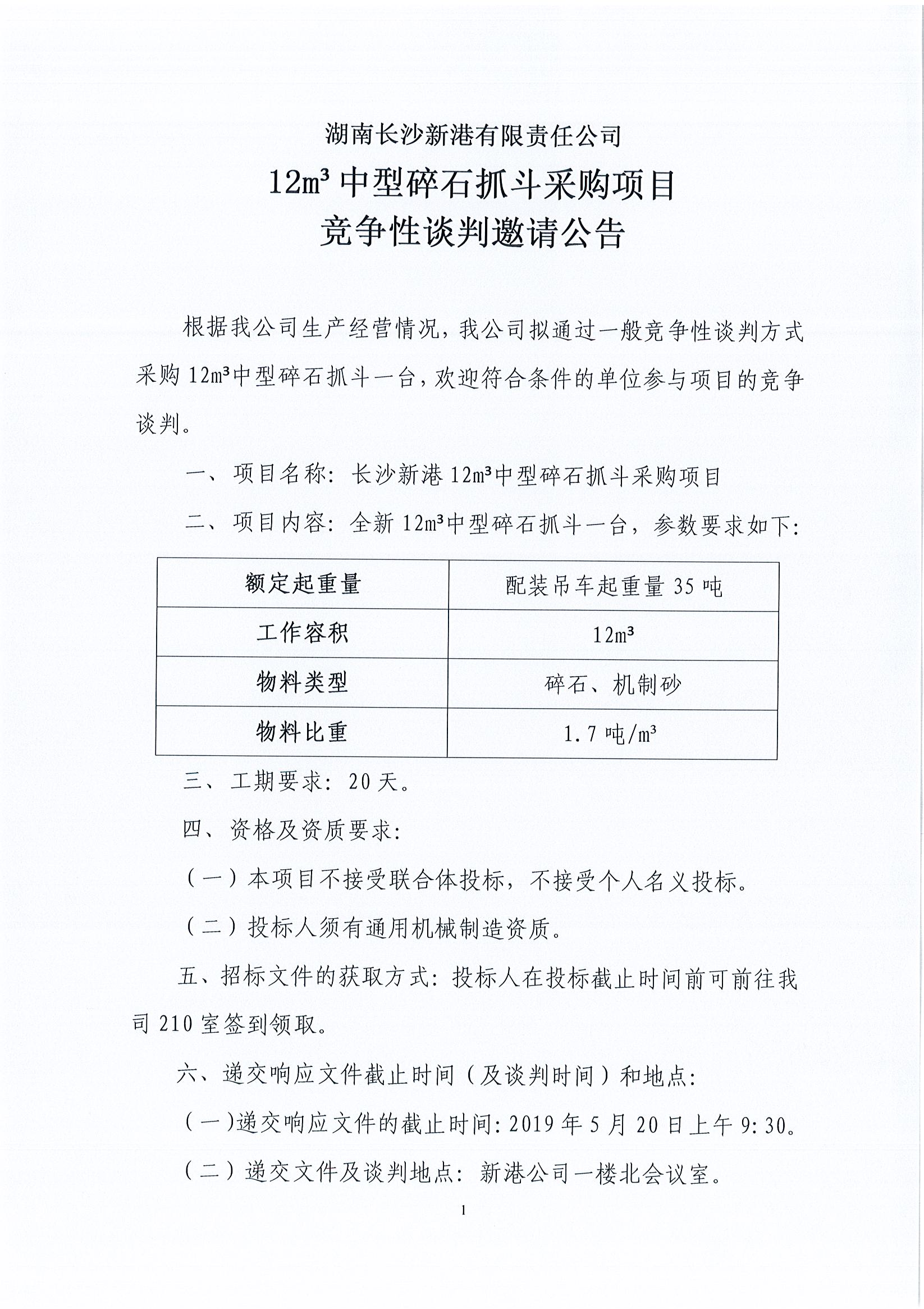 湖南長沙新港有限責(zé)任公司12m³中型碎石抓斗采購項目競爭性談判邀請公告