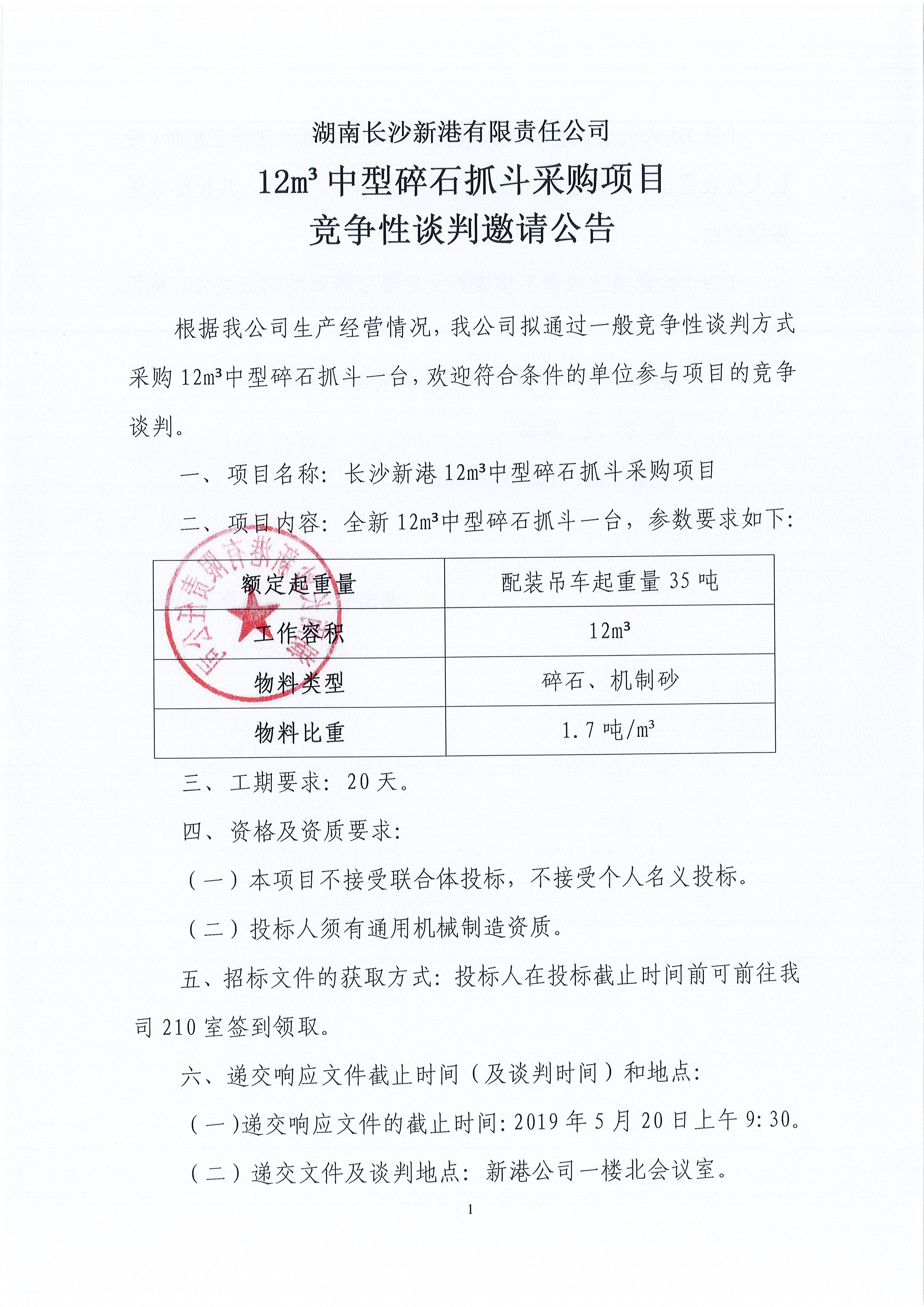 湖南長沙新港有限責任公司12立方中型礦石抓斗采購項目一般競爭性談判邀請公告