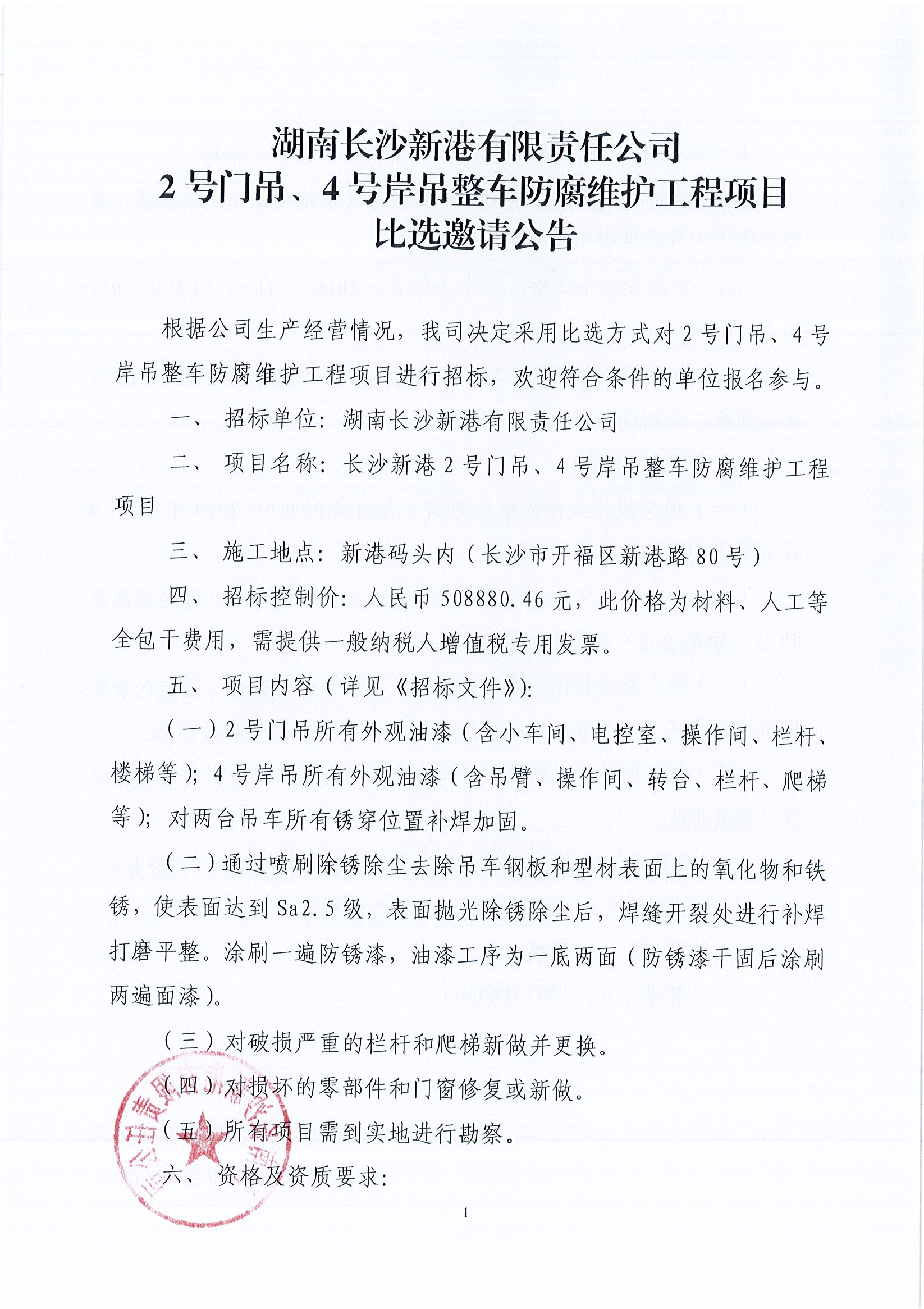 湖南長沙新港有限責(zé)任公司2號門吊、4號岸吊整車防腐維護(hù)工程項(xiàng)目比選邀請公示