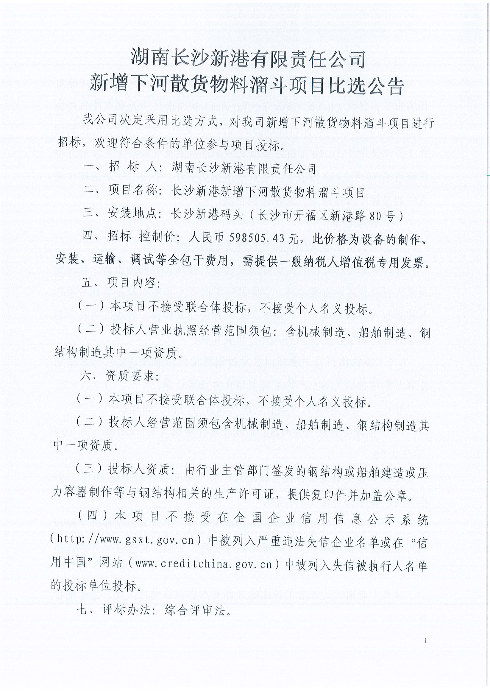 湖南長沙新港有限責(zé)任公司新增下河散貨物料溜斗項(xiàng)目比選公告