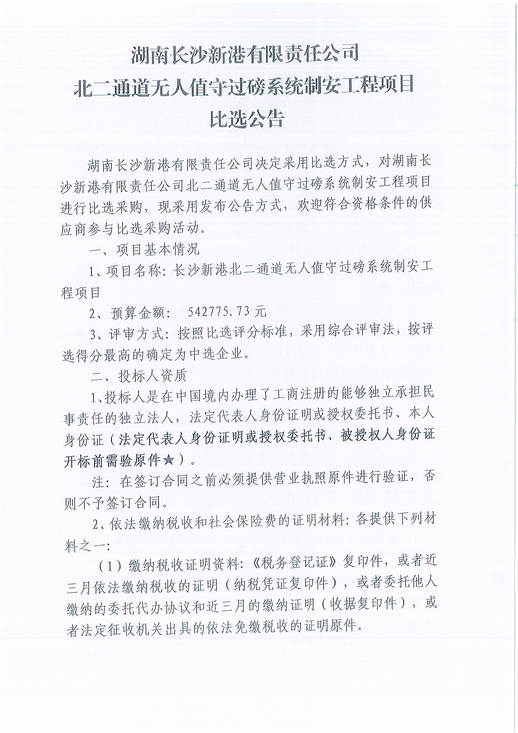湖南長(zhǎng)沙新港有限責(zé)任公司北二通道無(wú)人值守過(guò)磅系統(tǒng)制安工程項(xiàng)目比選公告