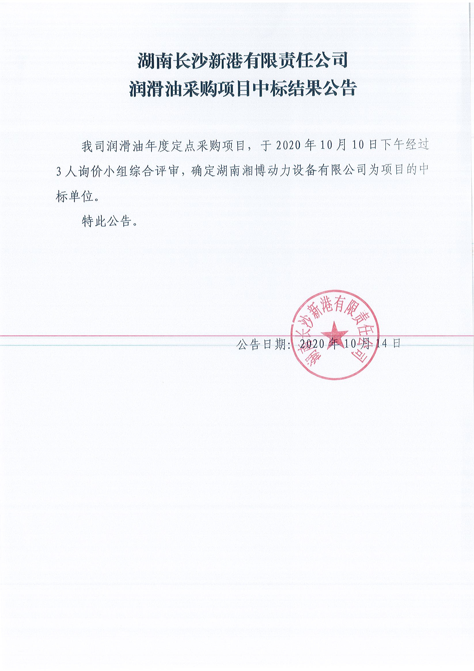 湖南長(zhǎng)沙新港有限責(zé)任公司潤(rùn)滑油采購(gòu)項(xiàng)目中標(biāo)結(jié)果公告