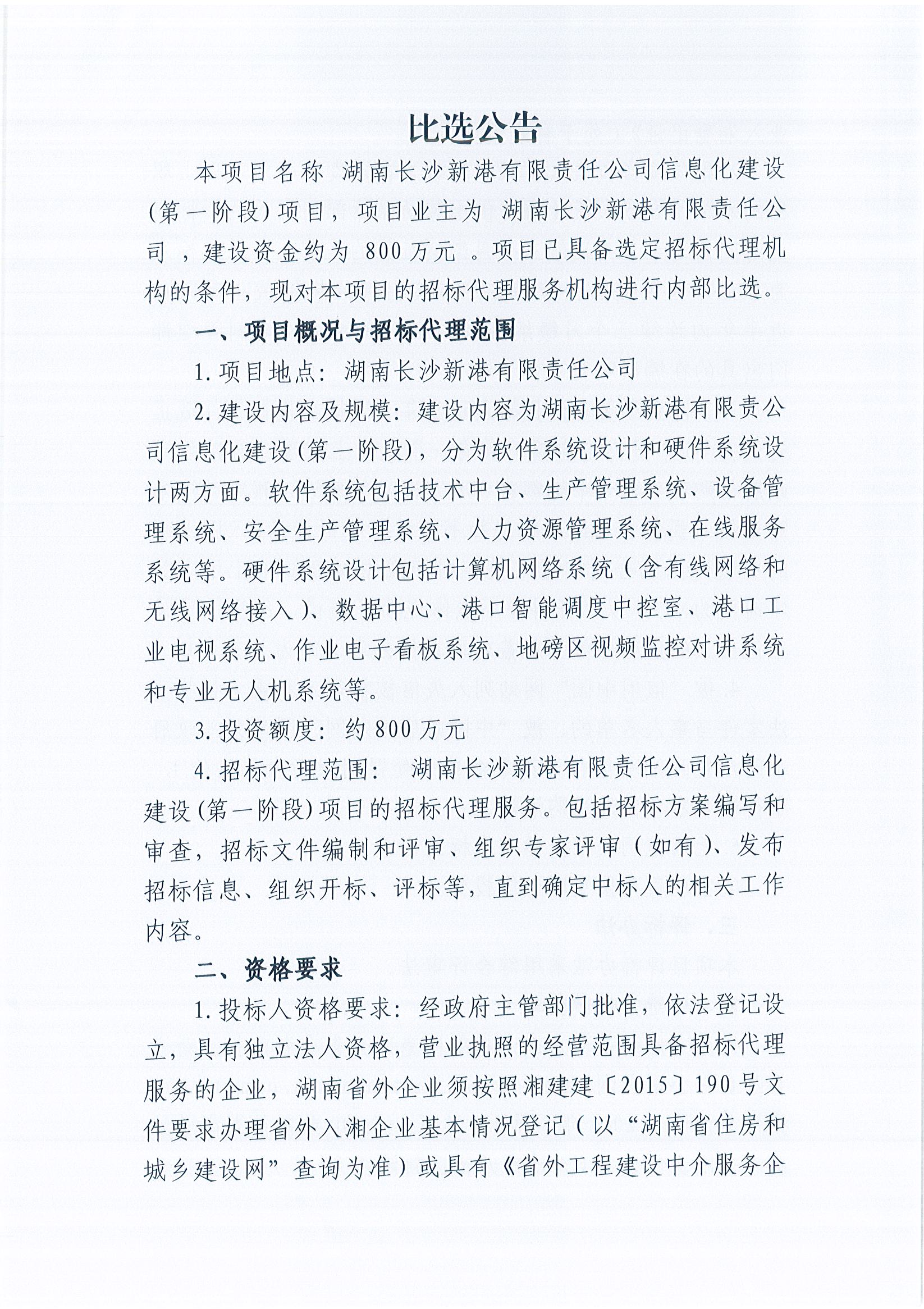 湖南長沙新港有限責任公司信息化建設(第一階段)招標代理服務機構比選公告