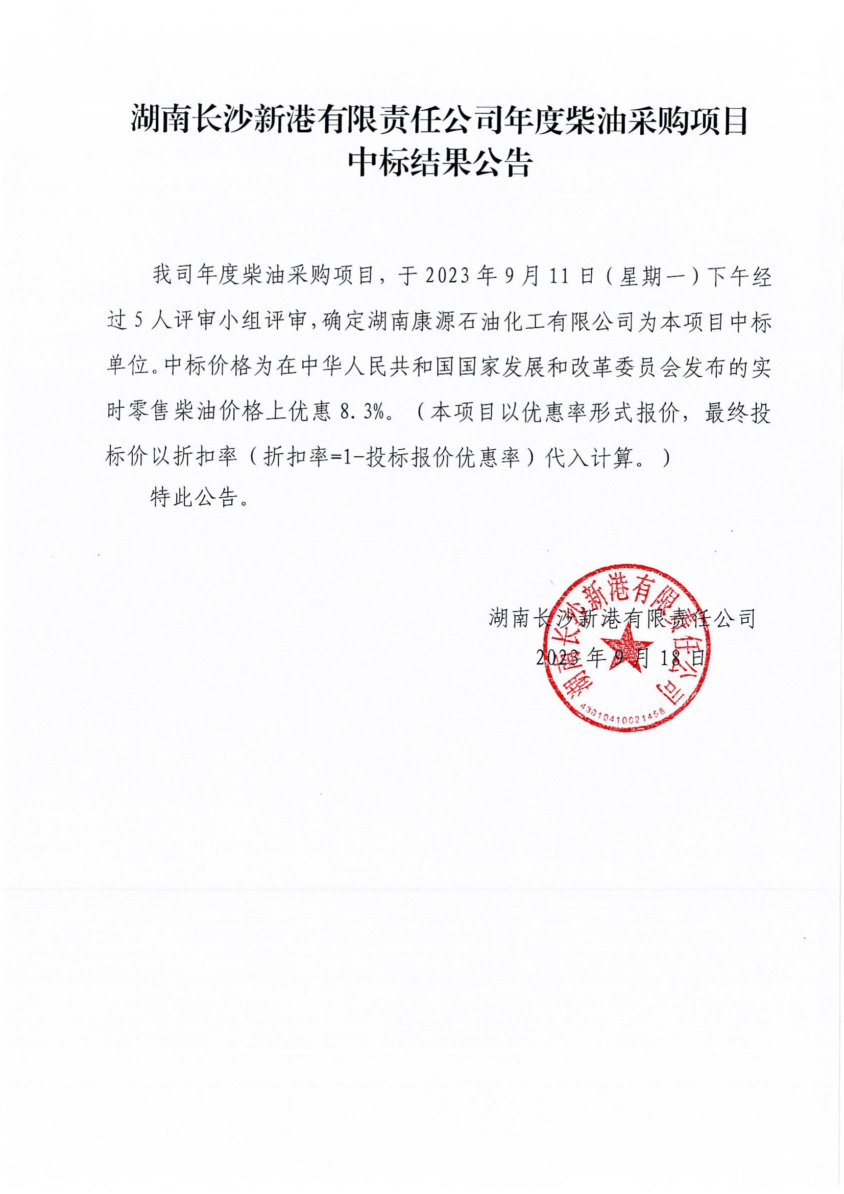 湖南長(zhǎng)沙新港有限責(zé)任公司年度柴油項(xiàng)目中標(biāo)結(jié)果公告