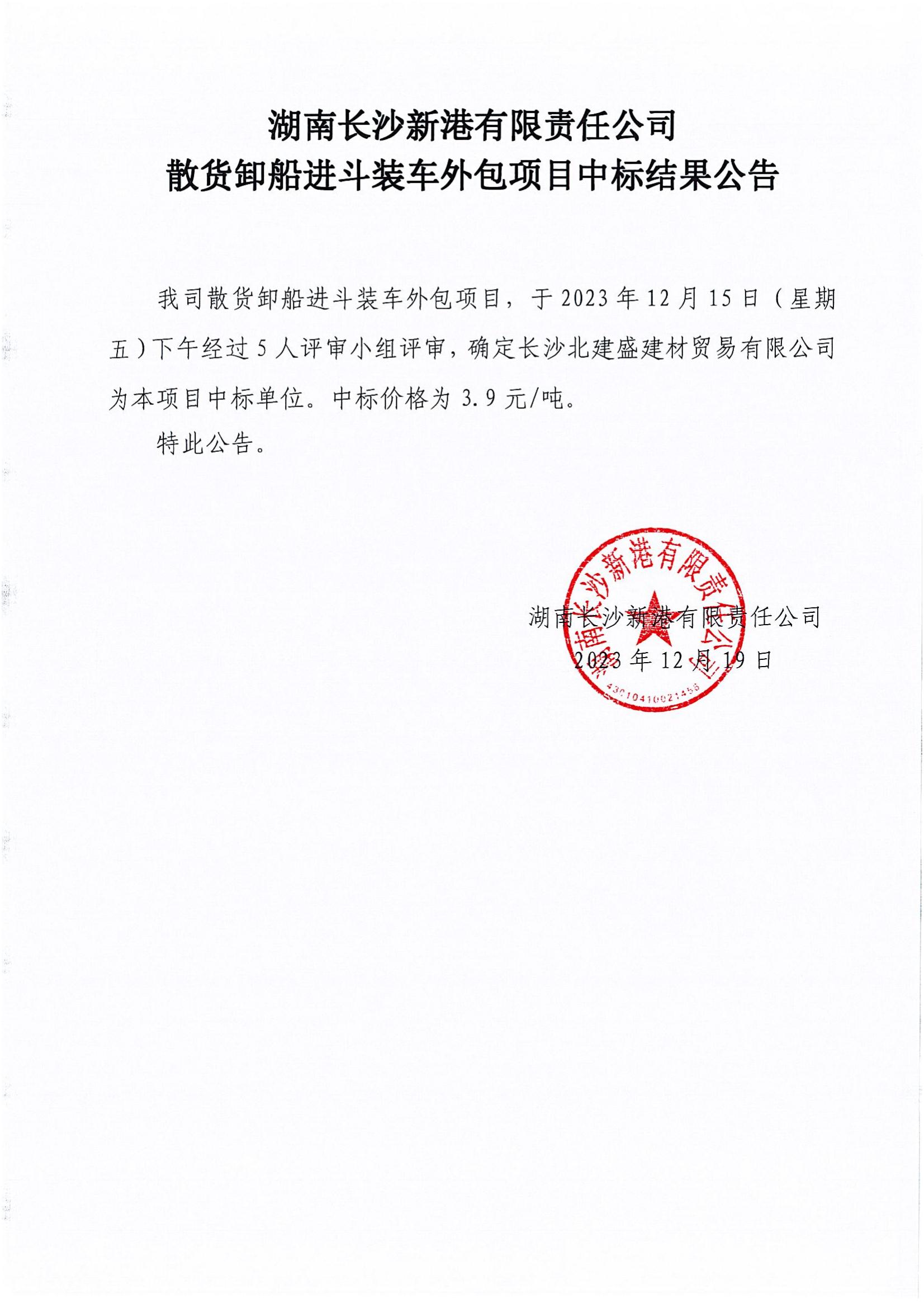 長沙新港散貨卸船進(jìn)斗裝車外包項(xiàng)目中標(biāo)結(jié)果公示